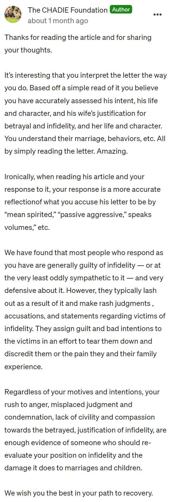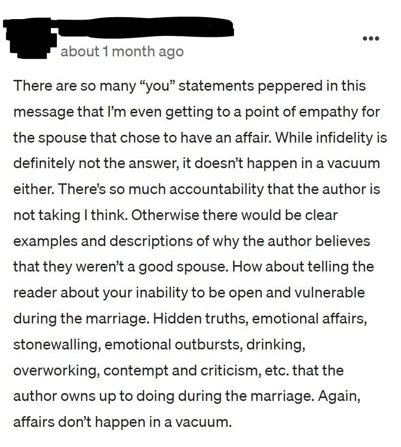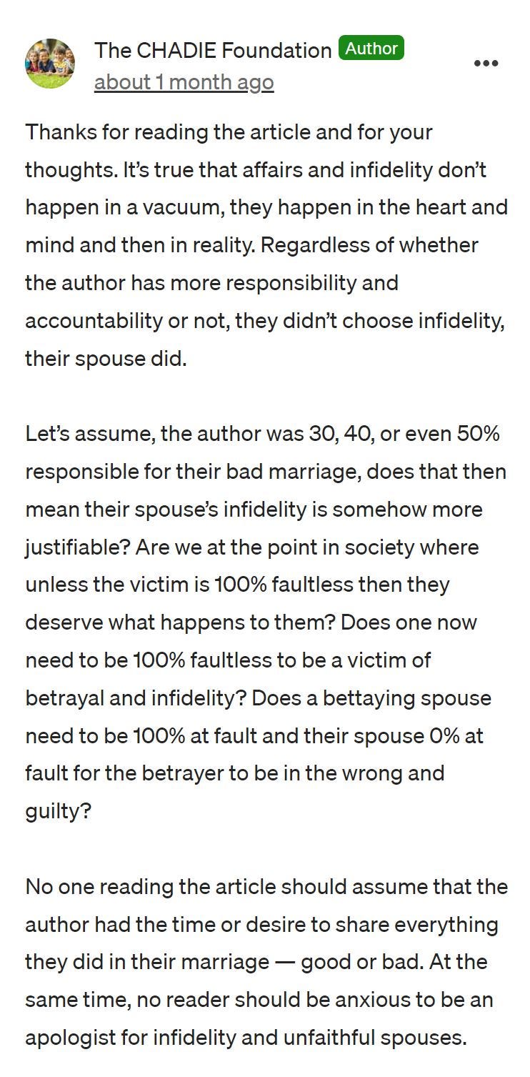 As noted in one of our replies, “Let’s assume, the author was 30, 40, or even 50% responsible for their bad marriage, does that then mean their spouse’s infidelity is somehow more justifiable? Are we at the point in society where unless the victim is 100% faultless then they deserve what happens to them? Does one now need to be 100% faultless to be a victim of betrayal and infidelity? Does a betraying spouse need to be 100% at fault and their spouse 0% at fault for the betrayer to be in the wrong and guilty?”