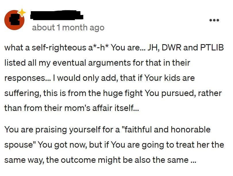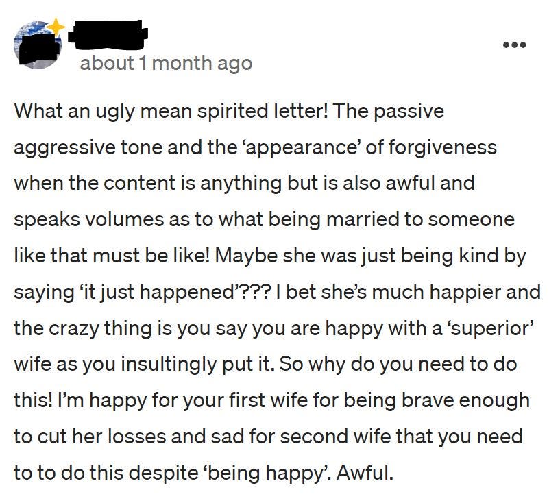 Those who attacked the author for including ‘you’ statements about his cheating wife, attacked the author like this: