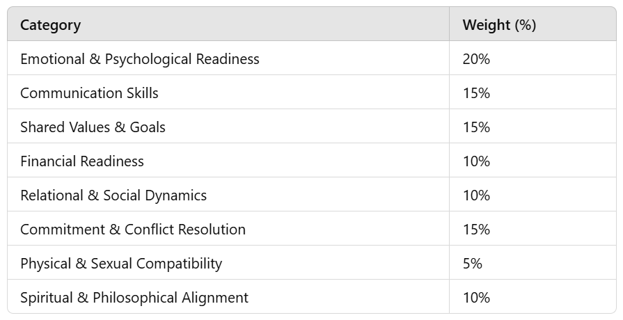 - Below 50%: Low readiness. Difficulty in managing conflicts or staying committed during hardships should be addressed before marriage.