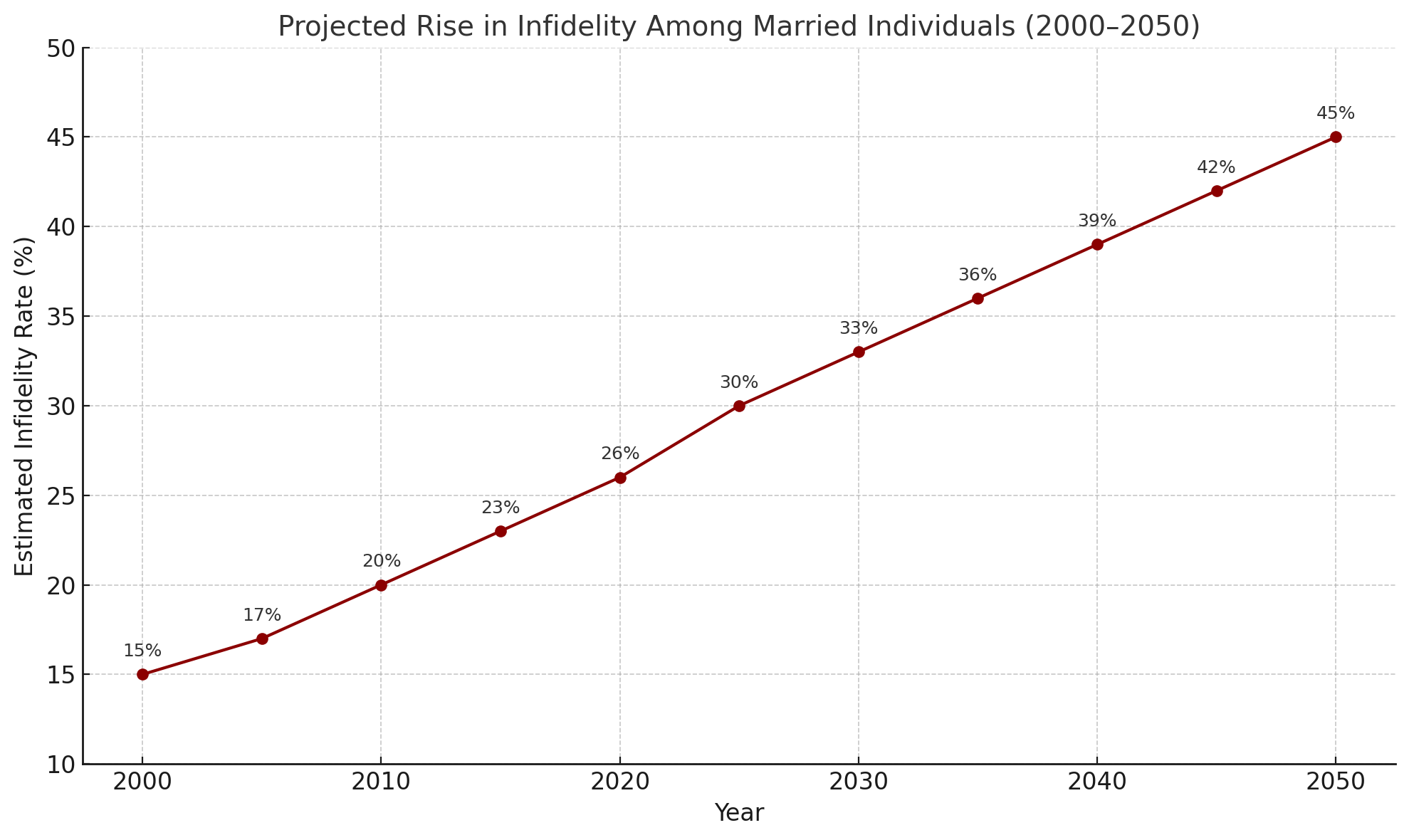 This chart illustrates a hypothetical but plausible trend based on current data and behavioral patterns, showing a steady increase in infidelity rates, potentially reaching 45% by mid-century if current societal shifts continue. (This projection is based on current data available. Given the nature of infidelity and its secrecy, the stats available today are likely understated.)